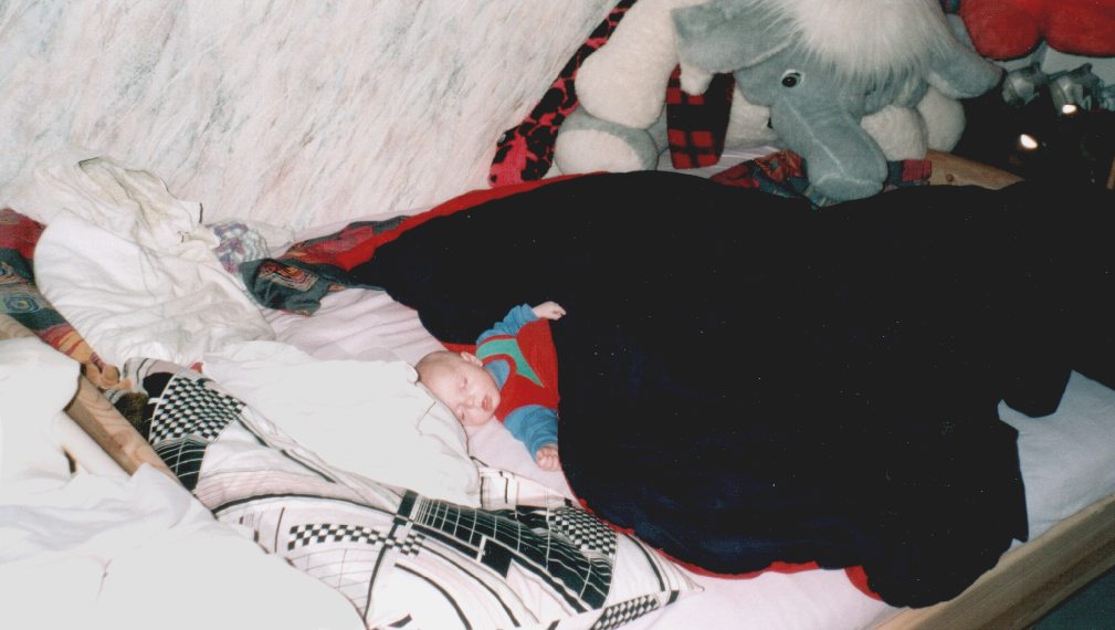 Das ist alles sehr aufregend und ich verstecke mich erst mal im Bett von Mama und Papa, da hat man endlich mal richtig Platz.