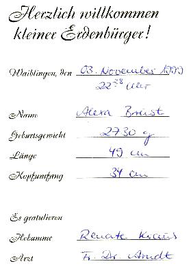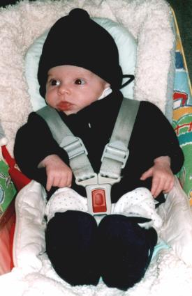 Heute (Sonntag 6.2.2000) habe ich meinen ersten Ausflug gemacht. Hier in meinem Kinderwagen ist es schön warm. Das Wetter ist ganz toll, Papa sagt, es hat mindestens 15°, wird dann wohl auch stimmen, ich glaube meinem Papa sowieso alles. Also auf jeden Fall laufen wir drei von Winnenden zum Spielplatz beim Korber Schützenhaus. Da ist ein ganz schöner Verkehr auf den Wanderwegen, aber das ist ja klar, bei dem tollen Wetter. Mama und Papa sagen, daß sei schwitzen müssen, aber daß ich schräg liegen muß, wenn es bergauf geht, davon redet wieder niemand.