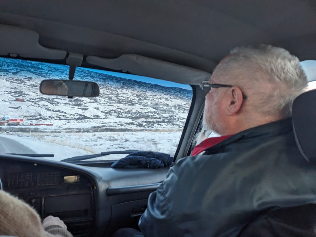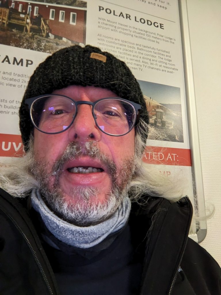 Die Waren schnell ins Zimmer legen und dann ab zum Museum, klappt leider so nicht, weil unsere Zutrittskarte nicht mehr funktioniert. Auch das dauert wieder seine Zeit, bis wir ins Zimmer kommen. Danach wollen wir in das Kangerlussuaq Museum gehen und uns dort aufwärmen. Liegt so 3 km von uns weg. Davor überreden wir noch die Souvenir Tante, dass Sie uns ein Taxi organisiert, welches uns zum Eisrand bringt. Es scheint zu klappen, morgen um 13:00 geht es los.