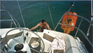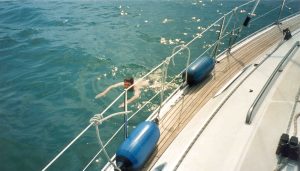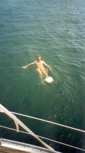 Wecken 7:00, Roby hat Brötchenholdienst. Aber mit dem Cityroller macht ihm das auch noch Spaß. Wolfgang ist in der Kombüse und bereitet das Frühstück vor. Bei herrlichem Sonnenschein Frühstücken wir an Deck. Ein bisschen Unterhaltung am Morgen bieten unsere Bootsnachbarn, sie üben den fröhlichen Sport „Handytauchen“ aus. Sie finden ihr gewassertes Handy dann auch mit dem zweiten Tauchgang. Der Wind geht leider gegen Null und so fahren wir mit Dieselwind in die Mainaubucht zum Baden. Wind ist null. Wir gehen alle Baden, wenn man erst mal drin ist macht es echt Spaß.