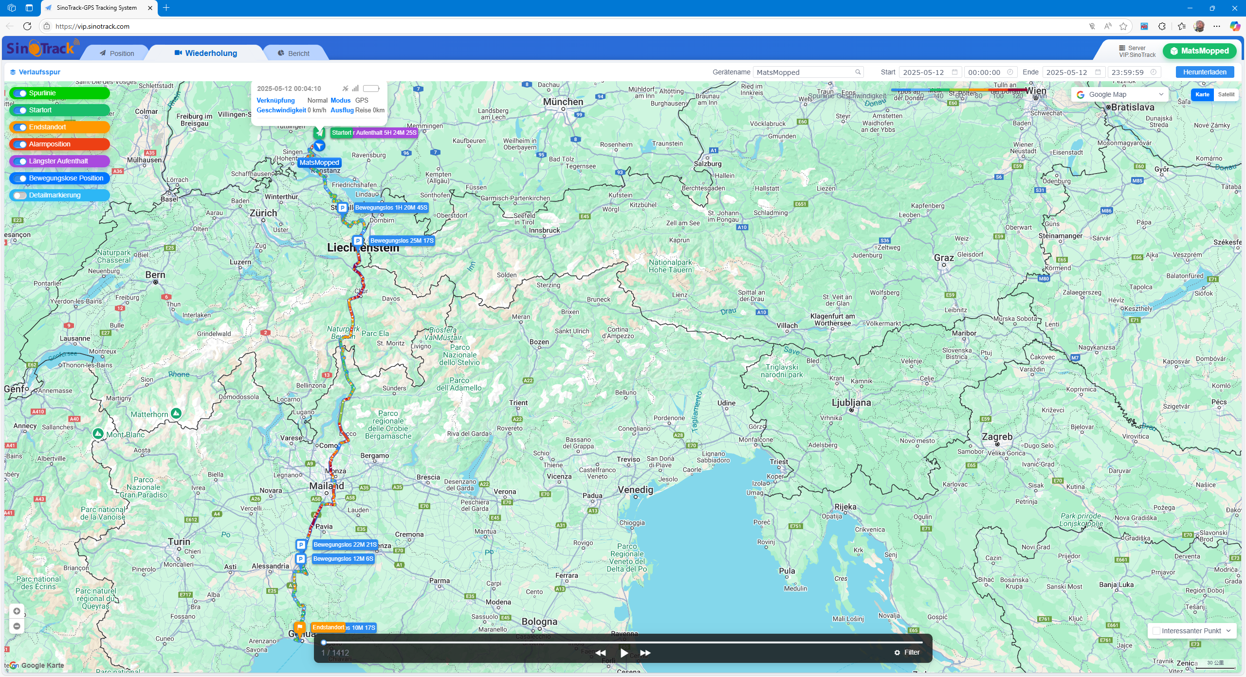 In Mailand erwischt es uns richtig – Starkregen – Auf der Autobahn stehen 10 cm Wasser, mein Auspuff hat ein paar mal Kontakt zum Wasser —> Dampfblase.