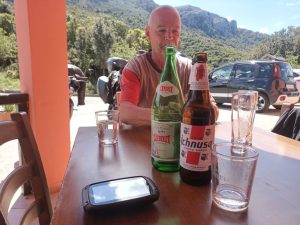 Dann geht es weiter auf der Autobahn in Richtung Schweiz. Dauerregen und 10 °C sind doch sehr erfrischend. Auf der Höhe sind es dann nur noch 5 °C. Wir gönnen uns deshalb tatsächlich in einem schweizer Rasthof einen gegrillten Lammspieß und dazu eine Dose Feldschlösschen. Es muss nur kalt genug sein, dann sind die Preise auf einmal egal.