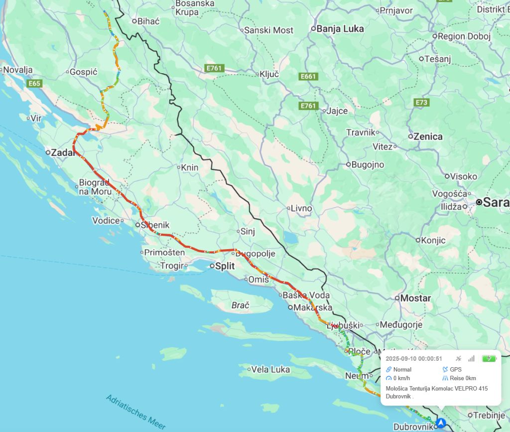 An einer Raststätte halten wir um die Handschuhe auszuwringen und schnell etwas trinken. Dann geht es gleich weiter bis zum Ende der Autobahn in der Nähe von Zadar. Ab dort geht es wieder auf Landstraßen voran, aber es ist wenigstens von oben trocken.